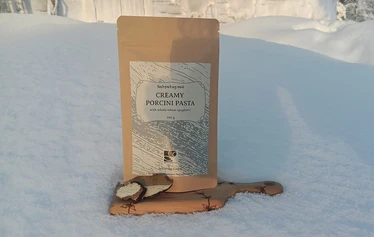 Kermainen tattipasta sisältää runsaasti herkkutattia sekä jauheena että isommissa paloissa.
